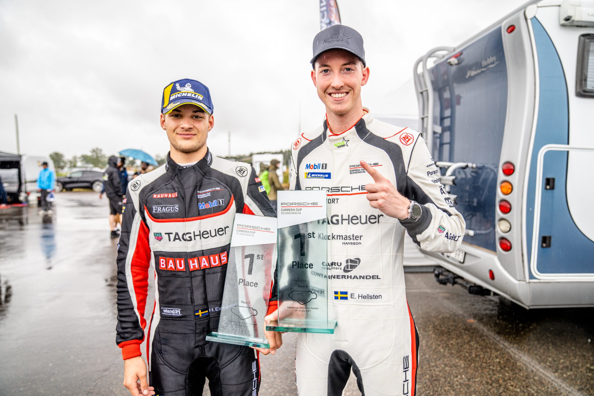 Klassiska Västkustloppet bjöd tuffa förhållanden, flera krascher – och två förstagångssegrare i Porsche Carrera Cup Scandinavia. Först ut var göteborgaren Edvin Hellsten, 24 år, som inte riktigt gått att känna igen i början på säsongen. I Falkenberg vände det. Han kvalade bra vilket gav honom andra startruta i det inledande heatet. En vinstlott skulle det visa sig.