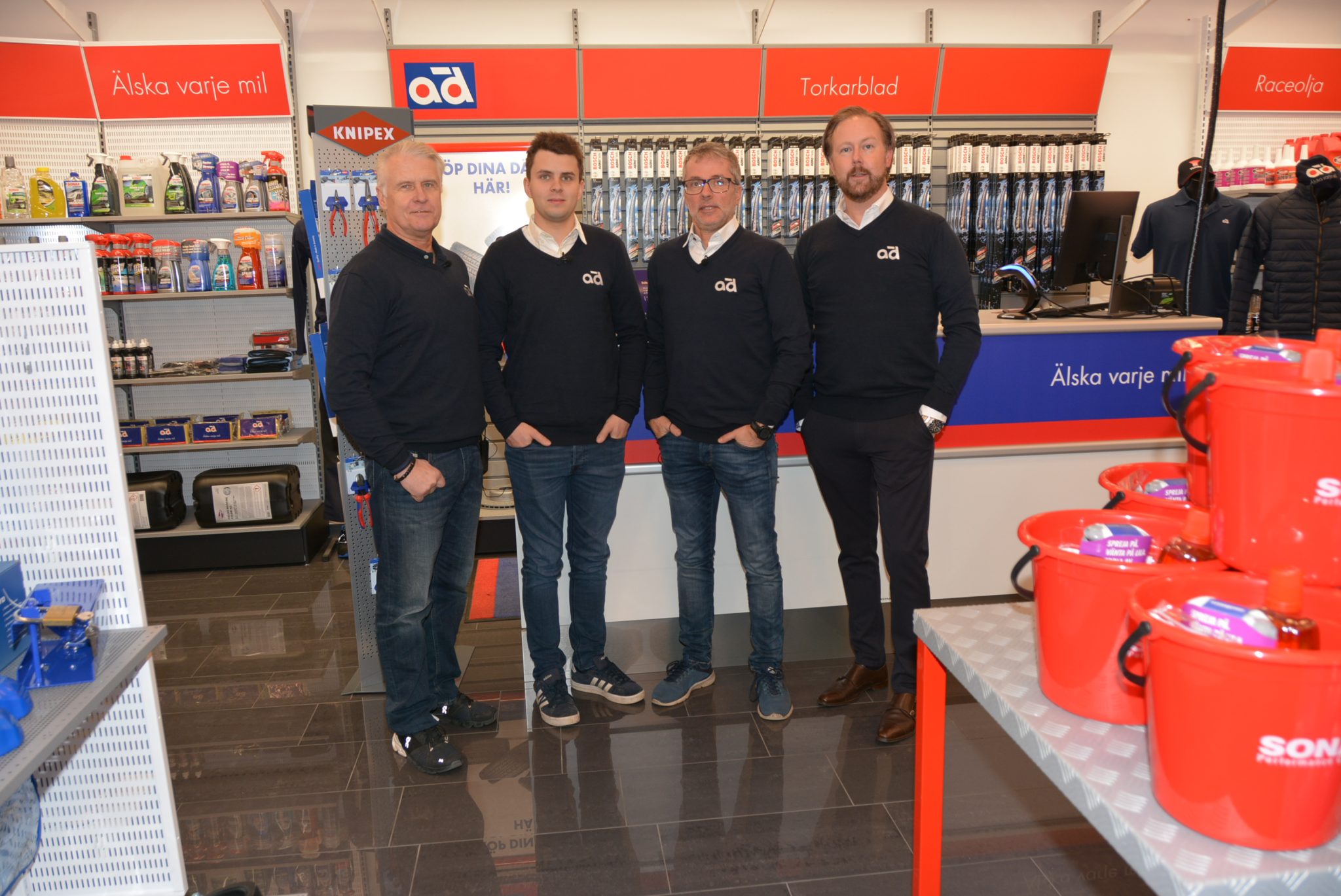 Gruppbilden, fr.v: Micke Kågered, Lukas Sundahl, Per Sundahl och Fredrik Bjerngren, AD Butik och Bilverkstad.
