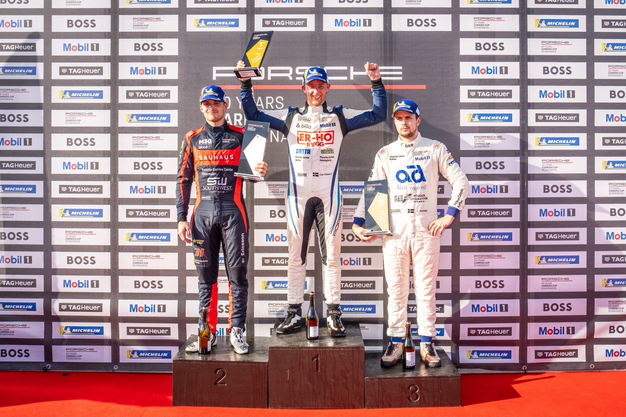 – Vi räknade inte ut oss, men konstaterade att nu är det fokus på allt som gäller, hela tiden, varje pass, varje varv. Och det har vi hållit, bortsett från fadäsen i Karlskoga när Ola körde av i ledning i det första heatet och tappade ner till femte plats, säger Karlsson som figurerat i Porsche Carrera Cup ända sedan starten 2004.