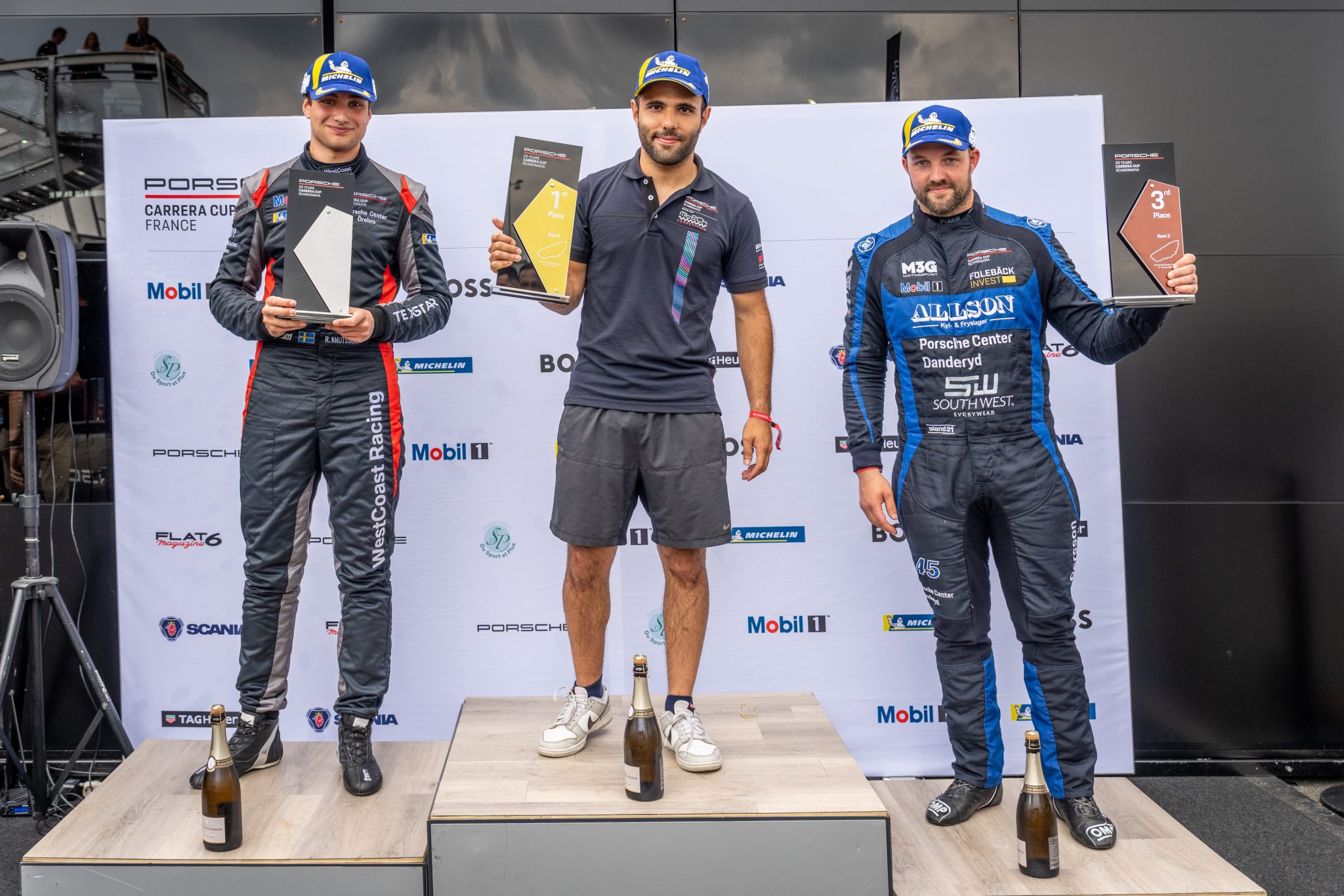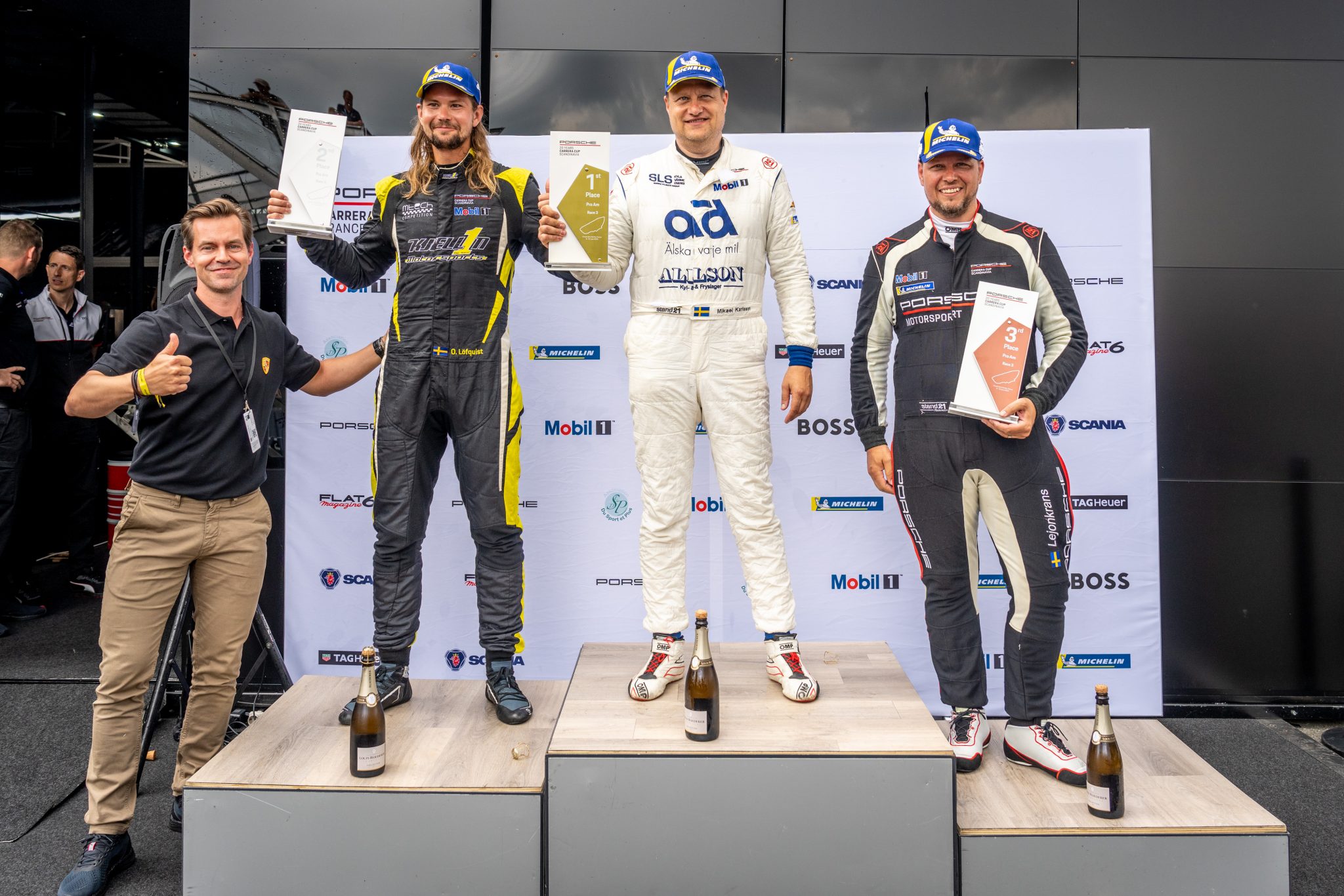 På prispallen i Porsche Carrera Cup Scandinavia fick värmlänningen sällskap av Oscar Löfquist och Kjelle Lejonkrans. Samtliga fick ta emot pokaler av prisutdelare Anders Boqvist, märkeschef Porsche Sverige.