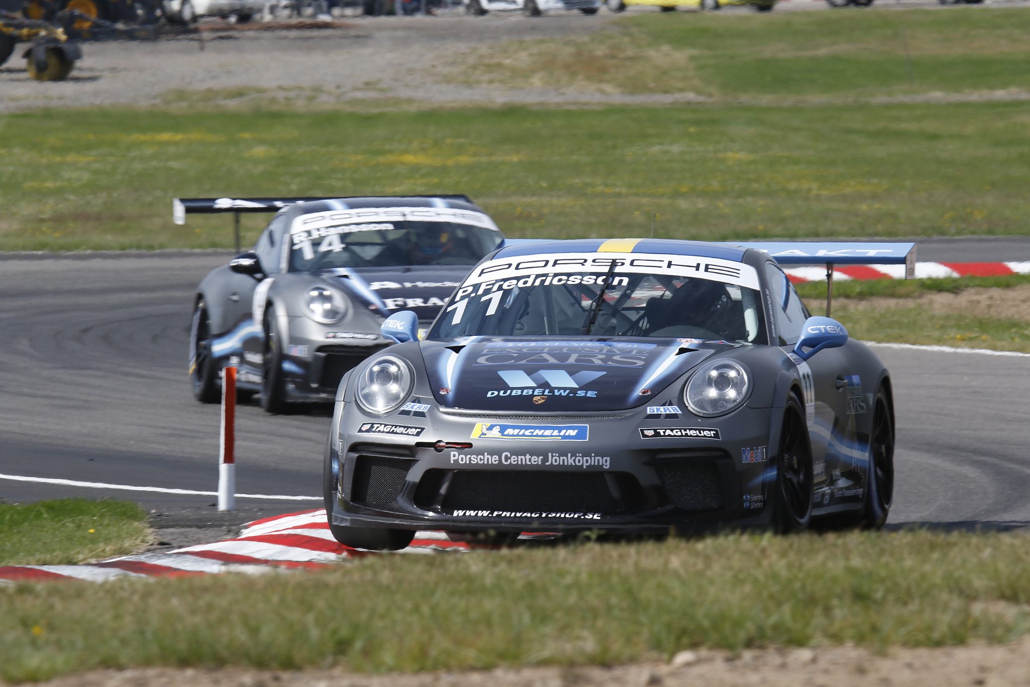 Men det är fler än Fredricsson som vill stå i pole position. I Falkenberg parkerades Sundahls svart-gula Porsche 911 GT3 Cup (991 II) i första startrutan i båda racen. Från det utgångsläget tog Lukas täten och behöll ledningen till mål.